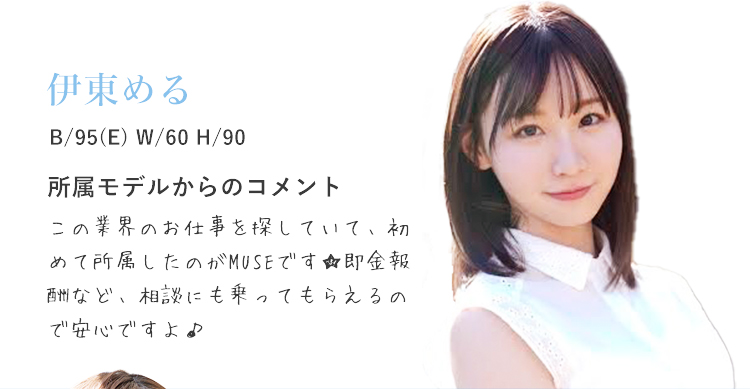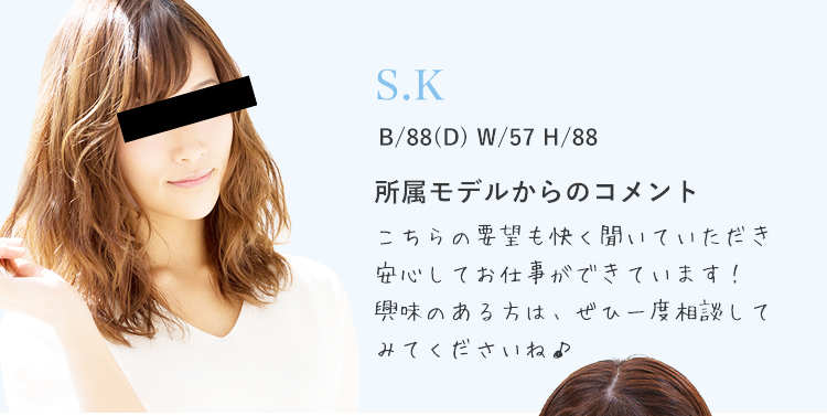 Aアルバイト感覚、副業として所属でもまったく問題ありませんし、当社に所属したからといって、今のお仕事を辞める必要もございません。実際に、週に1度、月に1度のお仕事と決めてお仕事を続けているモデルさんも多数在籍しております。あなたの都合を最優先してお仕事をご紹介致しますので、面接の際にはあなたの希望を教えて下さいね。